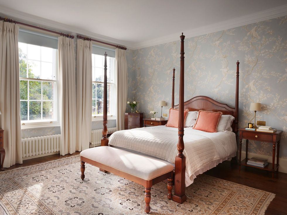 Upstairs in the master bedroom we commissioned a bespoke four poster bed and bedsides and sourced an intricate, antique rug to pull the scheme together. There is a secret door through the wardrobe that leads to the elegant master bathroom.